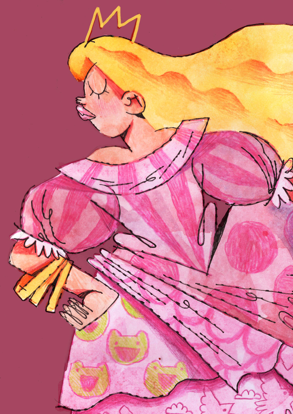 Серия иллюстраций рассказывает о принцессе, которая собирается на завтрак, примеряя различные наряды, но все никак не определится с выбором.