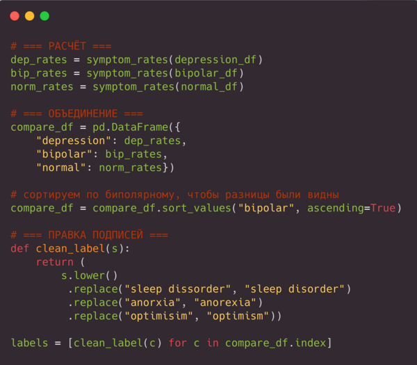 Например, становится очевидно, что грусть (sadness) встречается практически повсеместно и не является специфическим маркером, тогда как деструктивные мысли (suicidal thoughts) и руминация мыслей (overthinking) резко смещены в сторону депрессии (depression).