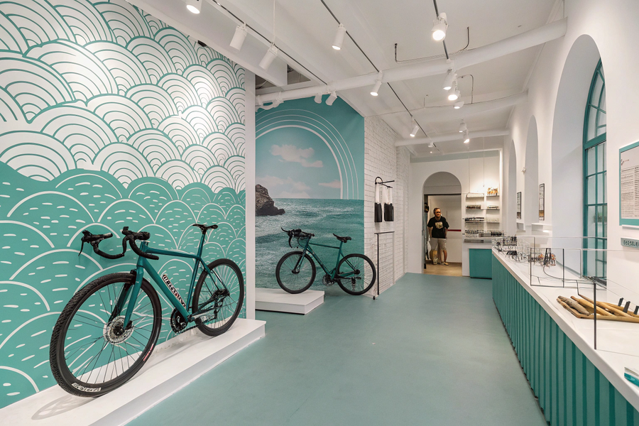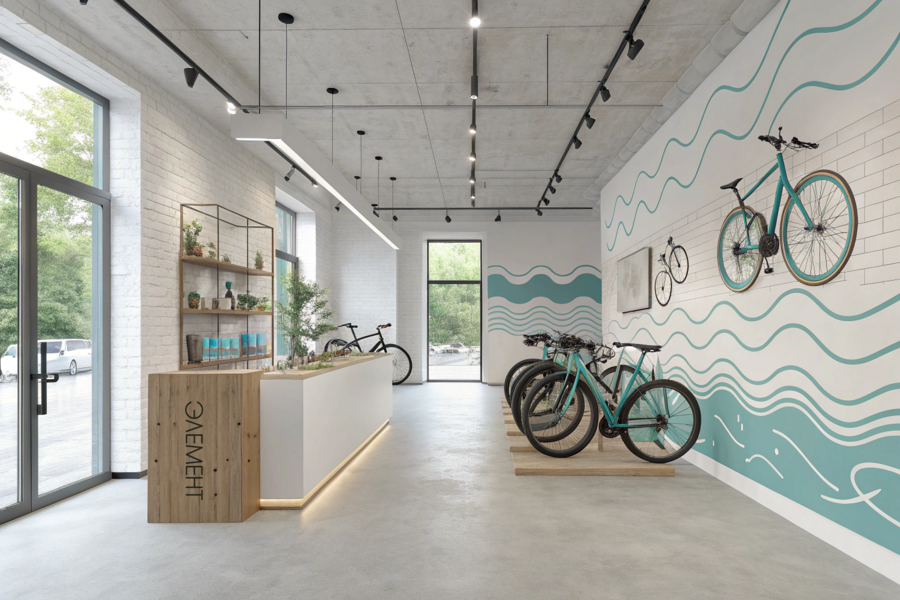 1 /image prompt: Bicycle showroom interior for ELEMENT, Kaliningrad. City and gravel bikes on display, white walls with teal wave graphics. Minimal signage, thin line bicycle icons, light wood, concrete floor, large windows. Calm Baltic-inspired colors, soft daylight, realistic, cinematic, modern retail. 2 /image prompt: Bicycle showroom interior, ELEMENT brand. White and teal color palette, wave patterns on walls. City and gravel bicycles, minimal signage. European coastal mood, realistic photography.