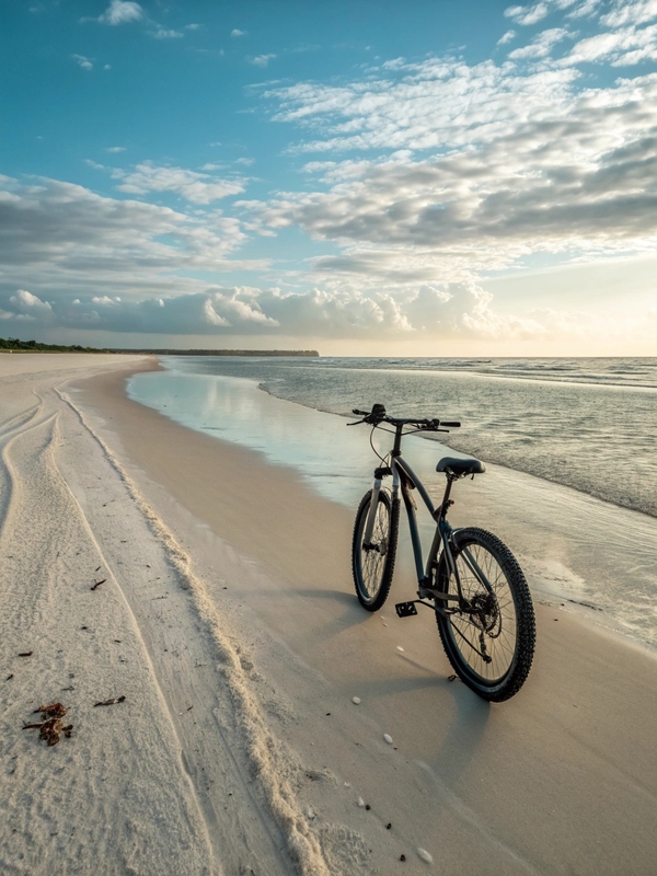 /image prompt: create dark green bicycle on a large rock by the sea, realistic coastal landscape, soft sunlight, waves in the background, calm natural colors, photorealistic, cinematic, high detail.