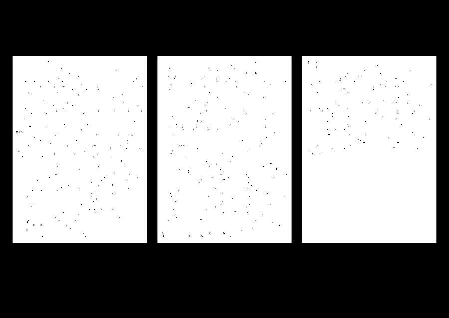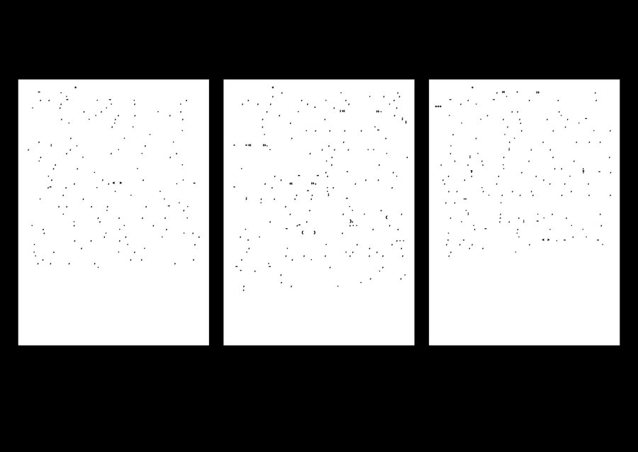 Композиционно каждый лист строится как стихограмма, где запятые, точки, тире и другие знаки препинания выступают акцентами и образуют абстрактную графику. Это пространство пустоты и отрешенности, в котором зритель призывается ощутить невысказанное, проникнуть в пространство между знаками, воспринимать тишину текста как самостоятельную форму знания.
