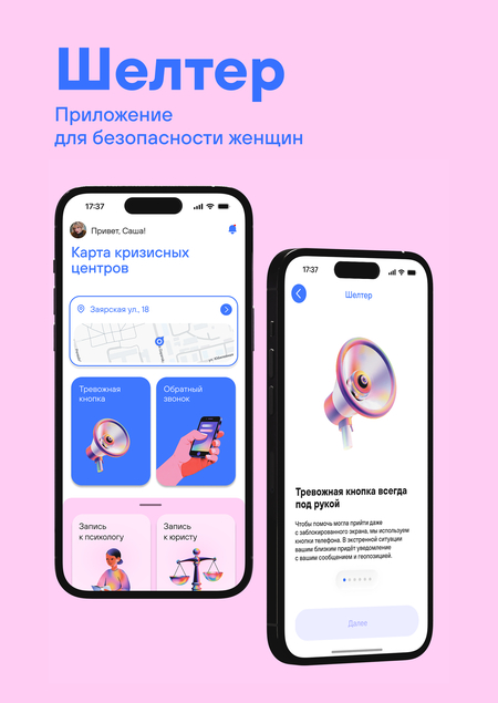 Это сервис безопасности и поддержки для женщин, оказавшихся в небезопасной ситуации. В приложении сделан фокус на инструментах для критических ситуаций (тревожная кнопка, фейковый звонок, карта ближайших кризисных центров), также есть раздел с короткими памяткам и быстрой записью к специалистам.