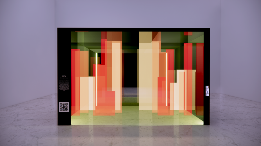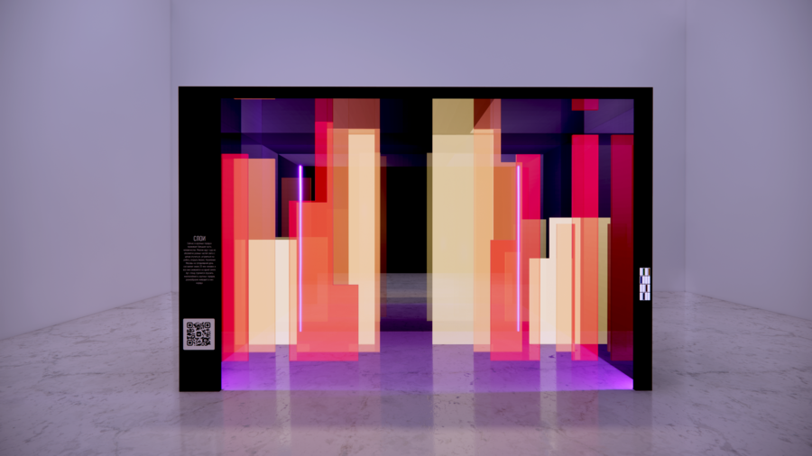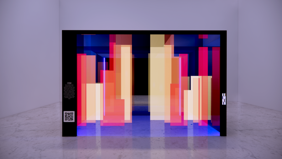 Объект проектируется как набор повторяемых рам/панелей на каркасе: элементы можно переставлять, менять плотность «слоёв» и адаптировать габариты под площадку; свет и графика прячутся в конструкцию, чтобы не перегружать внешний вид.