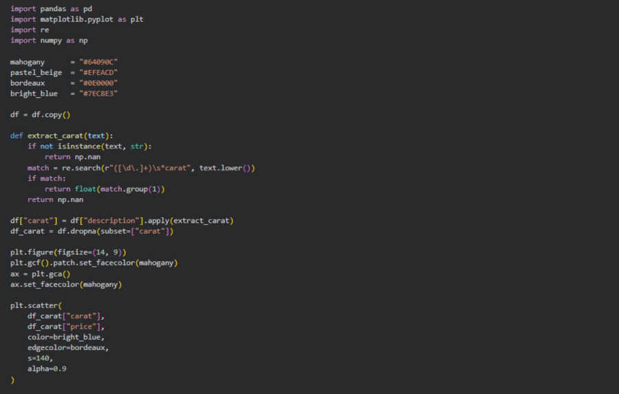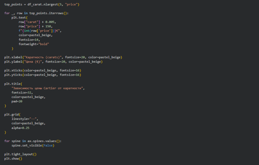 Визуальный анализ взаимосвязей — реализован с помощью диаграммы рассеяния для изучения зависимости между ценой изделия и его каратностью. Это позволило оценить характер связи между размером драгоценного камня и стоимостью изделия.