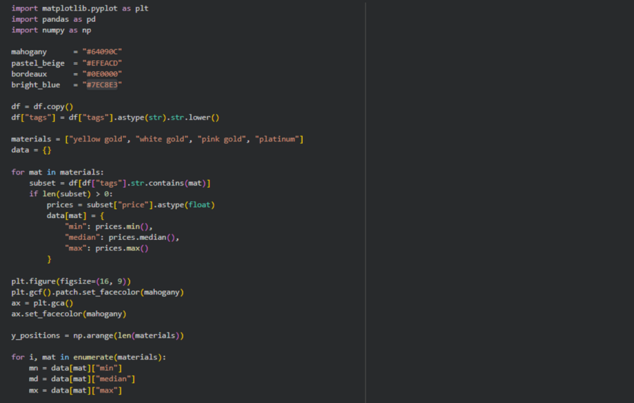 Сравнительный анализ категорий — реализован путём сопоставления ценовых характеристик изделий из различных материалов (жёлтое золото, белое золото, розовое золото, платина), что позволило выявить различия в ценовых профилях материалов.