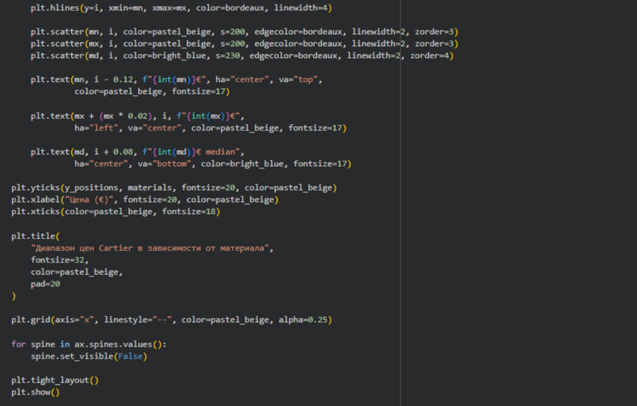 Описательная статистика и анализ диапазонов — использовались для оценки минимальных, медианных и максимальных значений цен изделий Cartier в разрезе используемых материалов. Это позволило охарактеризовать ценовой диапазон и типичный уровень стоимости для каждого материала.