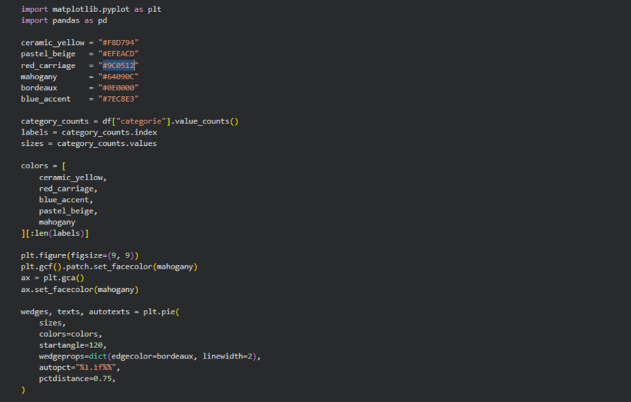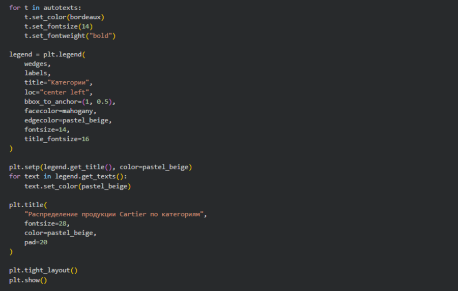 Структурный анализ категориальных данных — использовался для изучения распределения продукции Cartier по категориям. Круговая диаграмма позволила оценить доли различных категорий изделий в общем ассортименте.