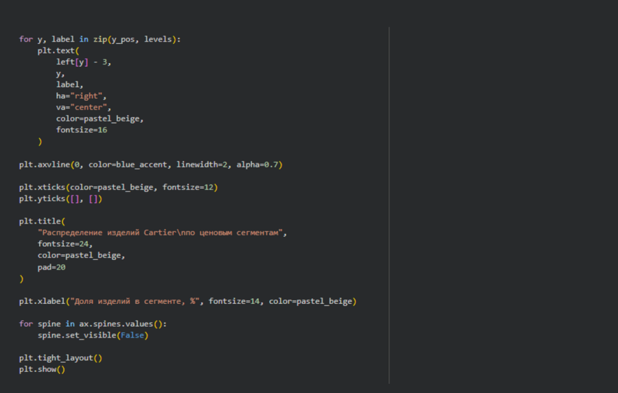 Анализ долей и структурных показателей — использовался для расчёта относительных долей изделий в каждом ценовом сегменте, что позволило наглядно представить баланс между массовыми и премиальными категориями продукции.
