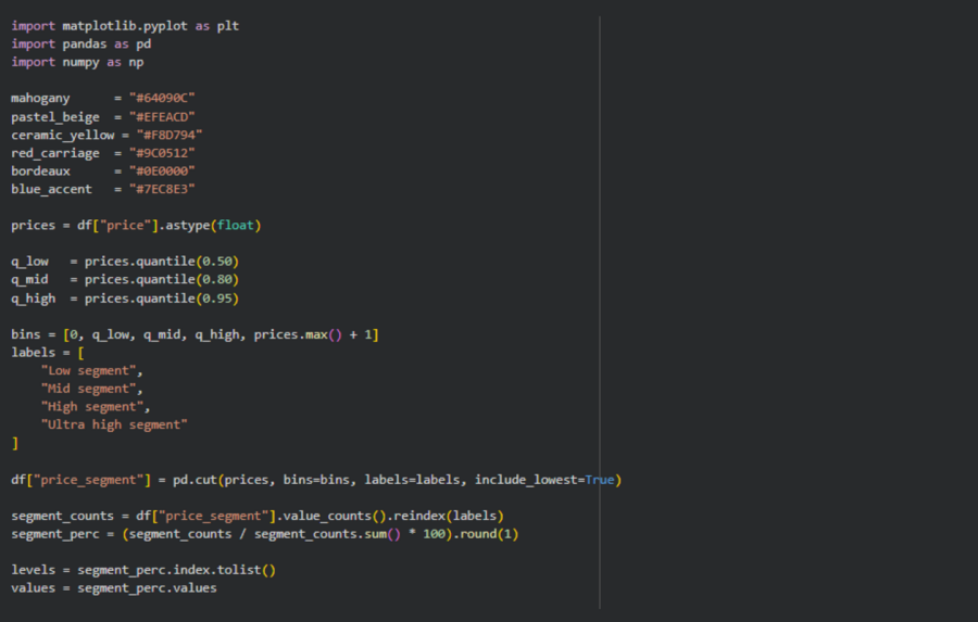 Сегментационный анализ — реализован путём распределения изделий по ценовым сегментам (низкий, средний, высокий и ультравысокий), что позволило оценить структуру ассортимента с точки зрения ценового позиционирования бренда.