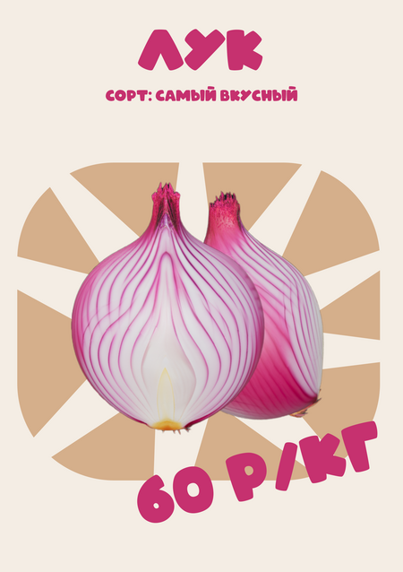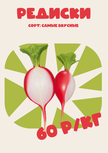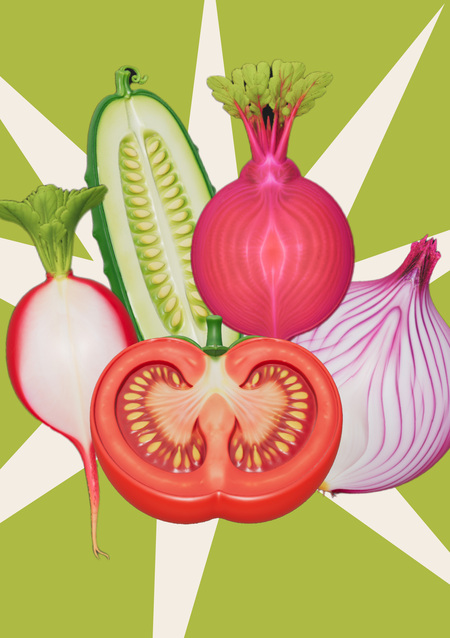 Я загрузила в ChatGPT референсы овощей в разрезе (помидор, огурец, редис, лук, свекла) и задала единые условия визуала — белый фон, студийный свет, одинаковый масштаб и ракурс. Затем, используя встроенную модель генерации изображений, я сгенерировала пять картинок в одном стиле: с узнаваемым внешним силуэтом и аккуратно упрощённой внутренней структурой (семечки, слои, кольца).