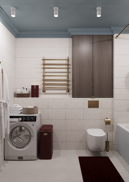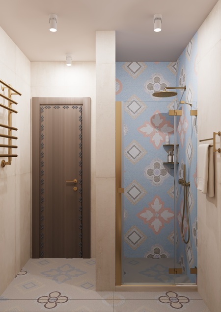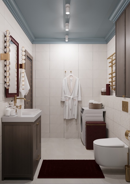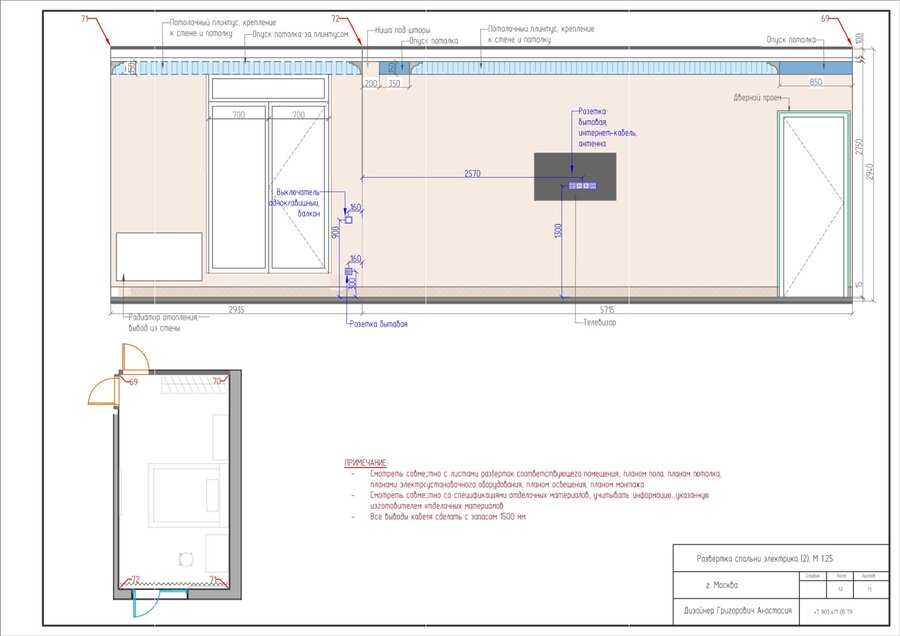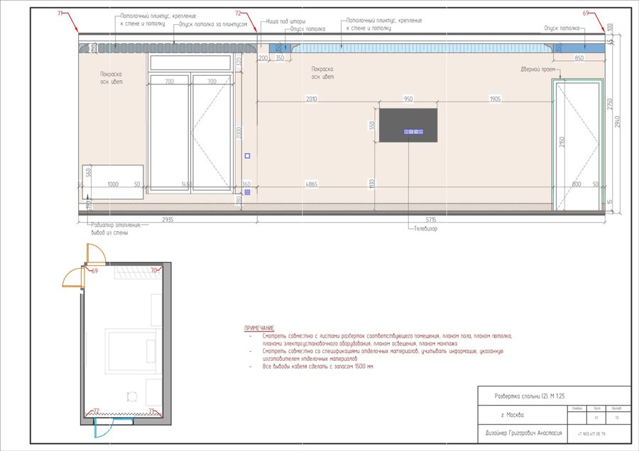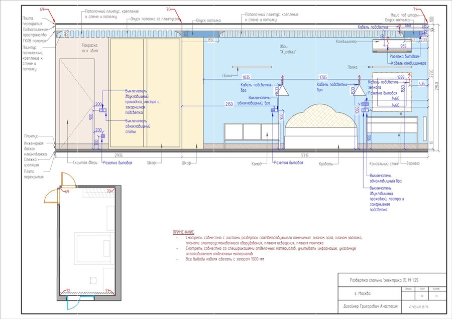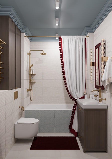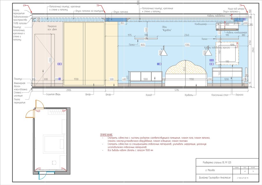 Обои на стене, выполнены по мотивам декораций к балету Дягилева, а изголовье кровати напоминает форму кокошника. Голубой карниз по периметру спальни и опуски потолка визуально сокращают помещение.