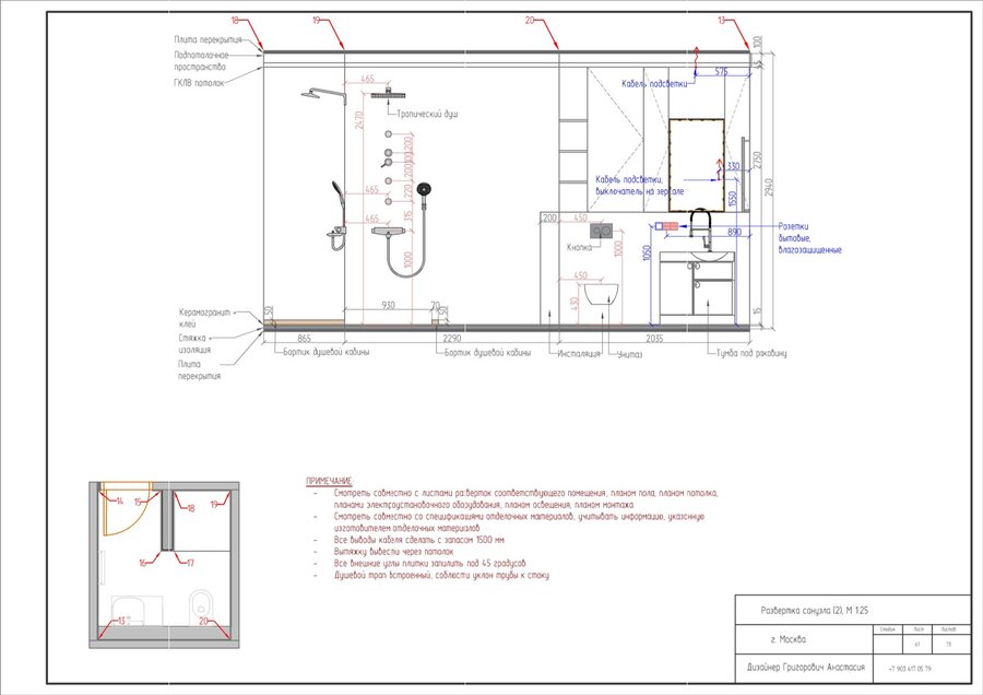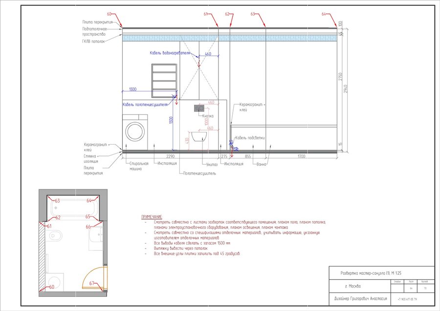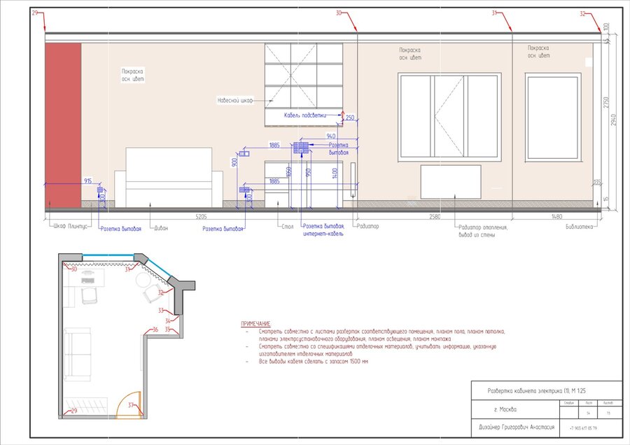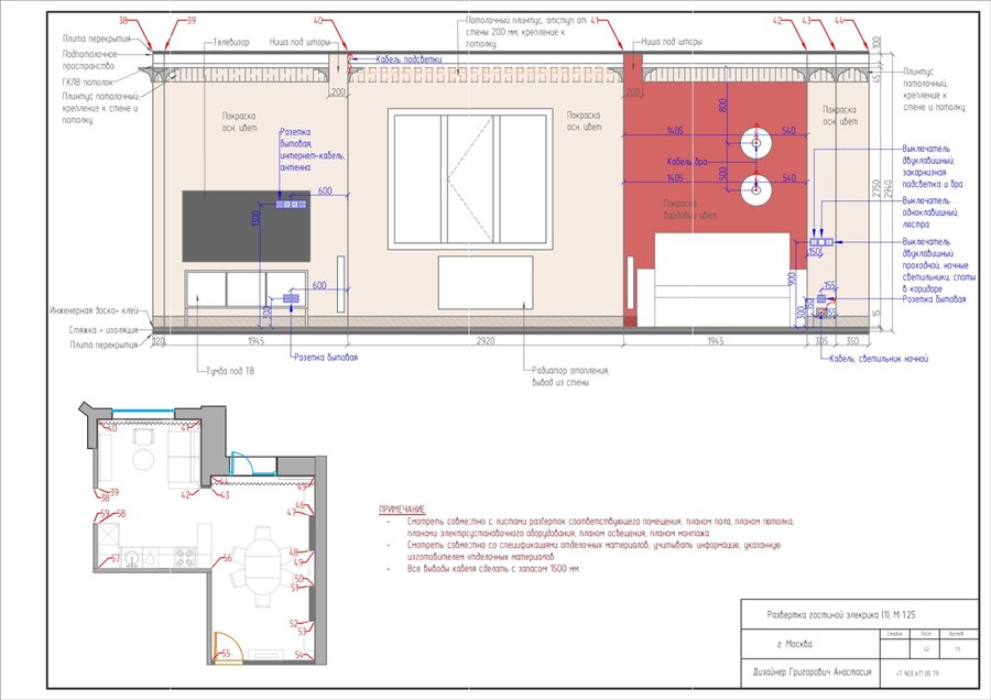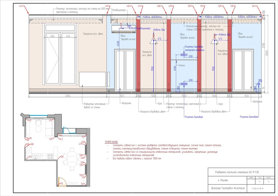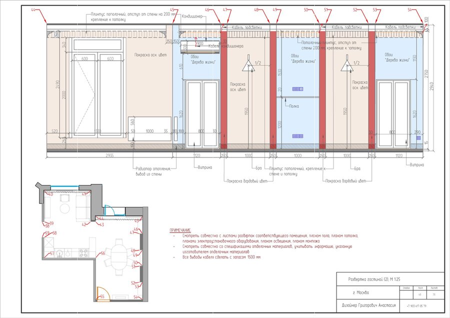 Обои на стене, выполнены по мотивам декораций к балету Дягилева, а изголовье кровати напоминает форму кокошника. Голубой карниз по периметру спальни и опуски потолка визуально сокращают помещение.