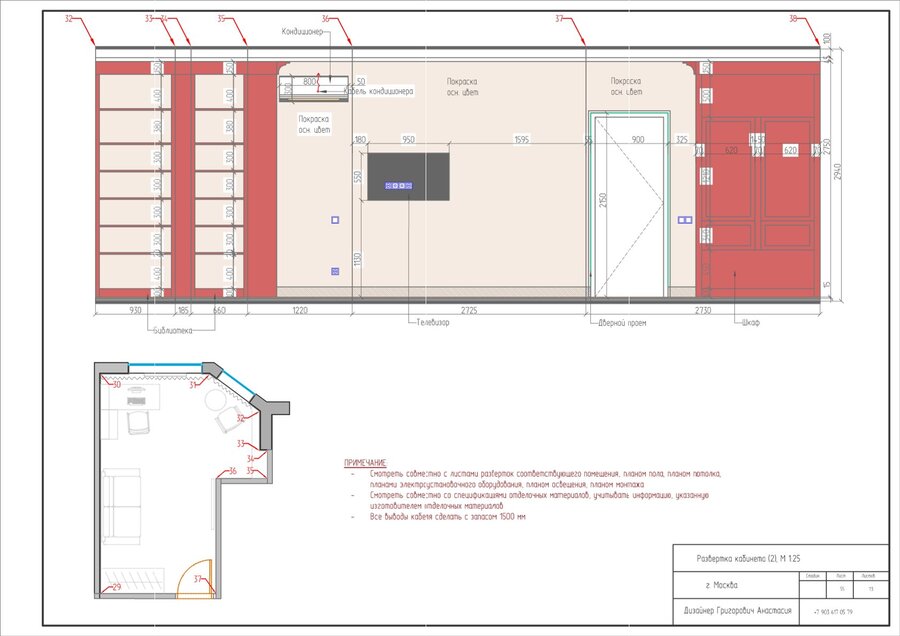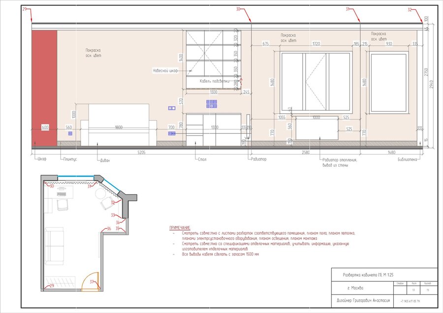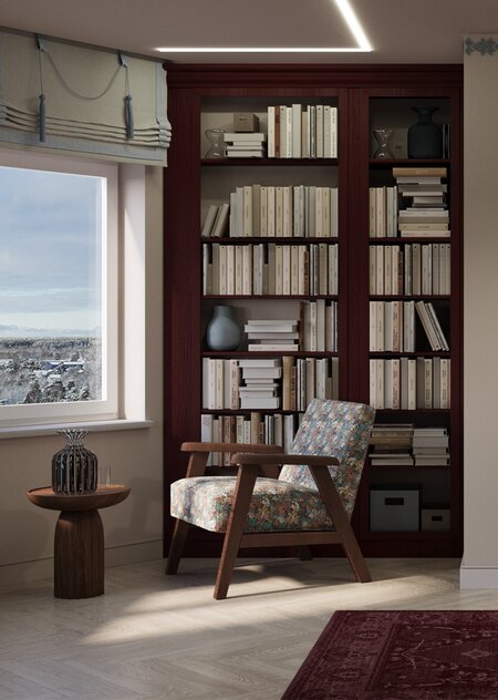 В кабинете напротив двух видовых окон располагается библиотека и рабочая зона. Внимание притягивает шкаф, дверцы которого украшены тканевыми вставками с животными.