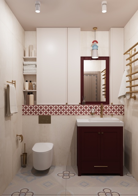 Прихожая сочетает цветовую палитру и стиль всей квартиры. Здесь есть деревянные панели с русским узором, обои «Дерево жизни», яркие бардовые акценты и этническая картина.