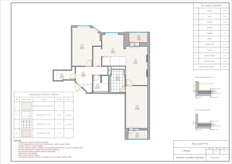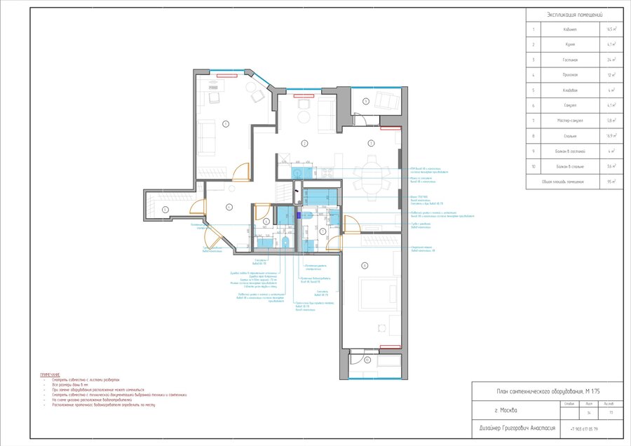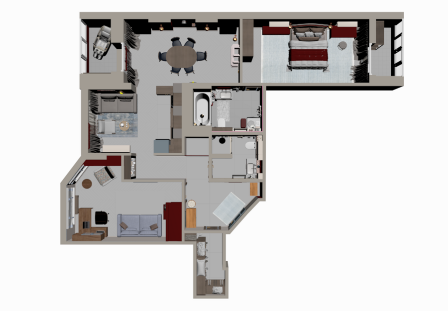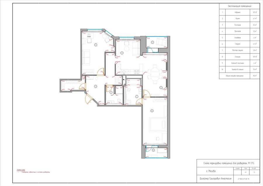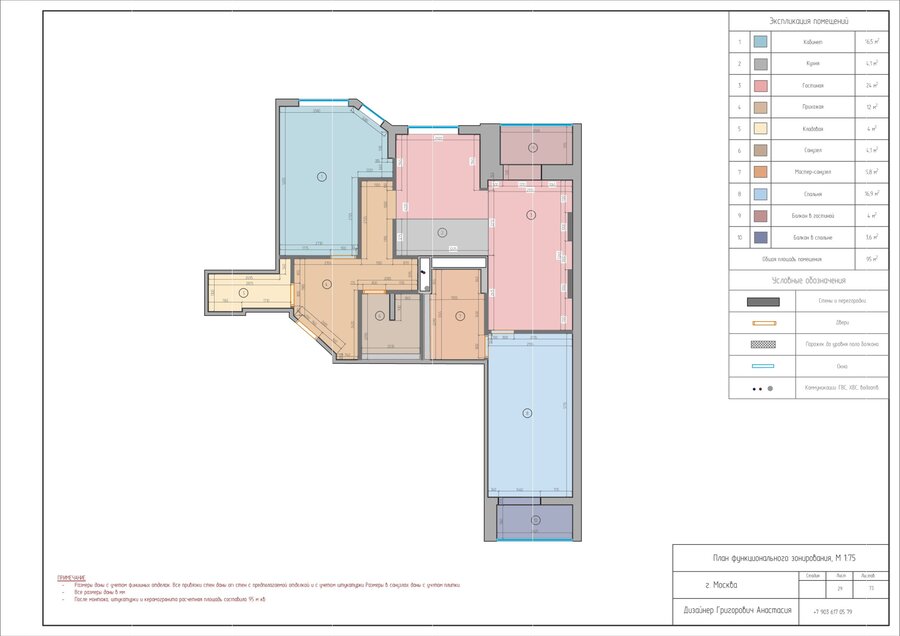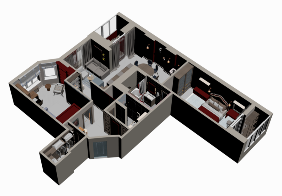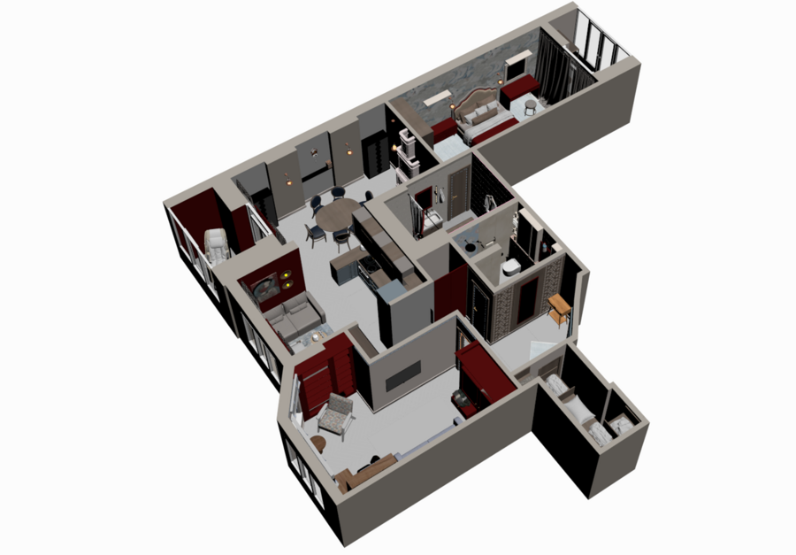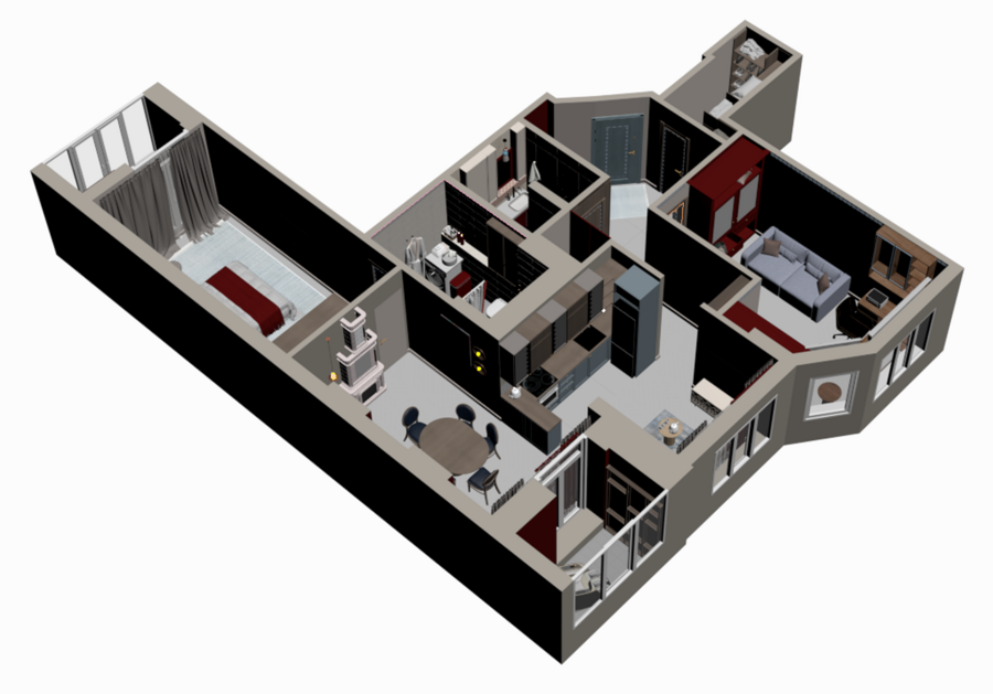 В планировочном решении кабинет хозяина располагается рядом со входом, чтобы люди, входящие в квартиру, попадали туда без захода в жилую зону. В прихожей, для удобства, расположен вход в санузел. Входная дверь не видна из жилой зоны гостиной и кухни. Окна кабинета, гостиной и кухни располагаются на видовой стороне, а в спальне хозяйки это необязательно. Для нее оборудована мастер-спальня с балконом для растений и санузлом, вход в которую располагается за скрытой дверью из зоны гостиной.