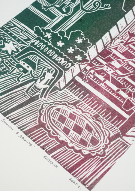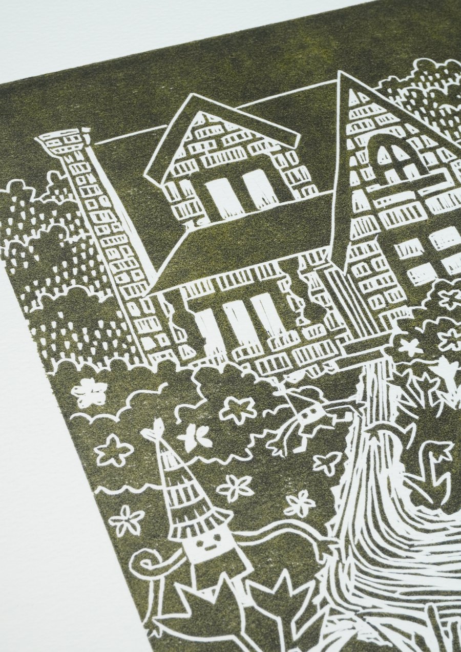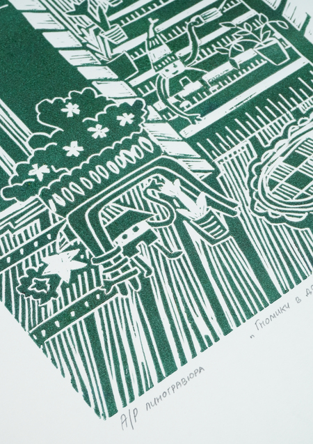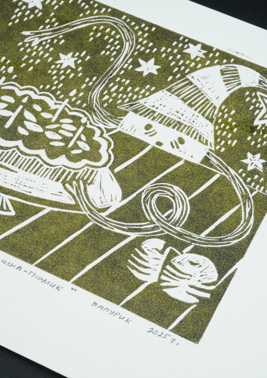 «Гномики в домике», 2025, линогравюра, размер: 29,7 см х 42 см