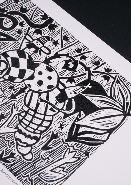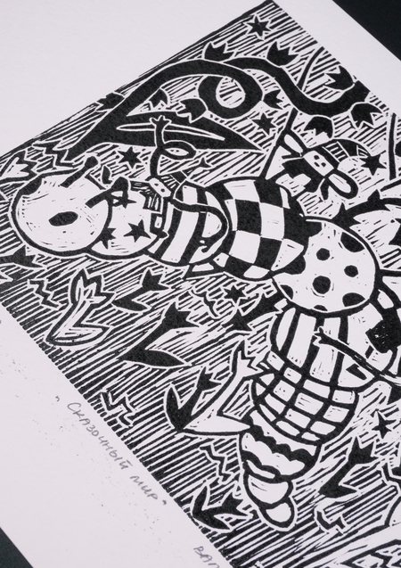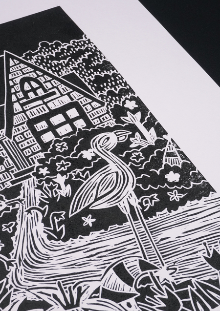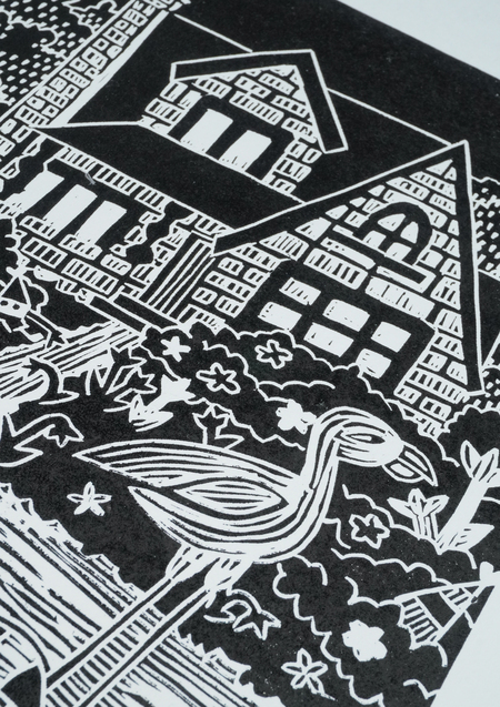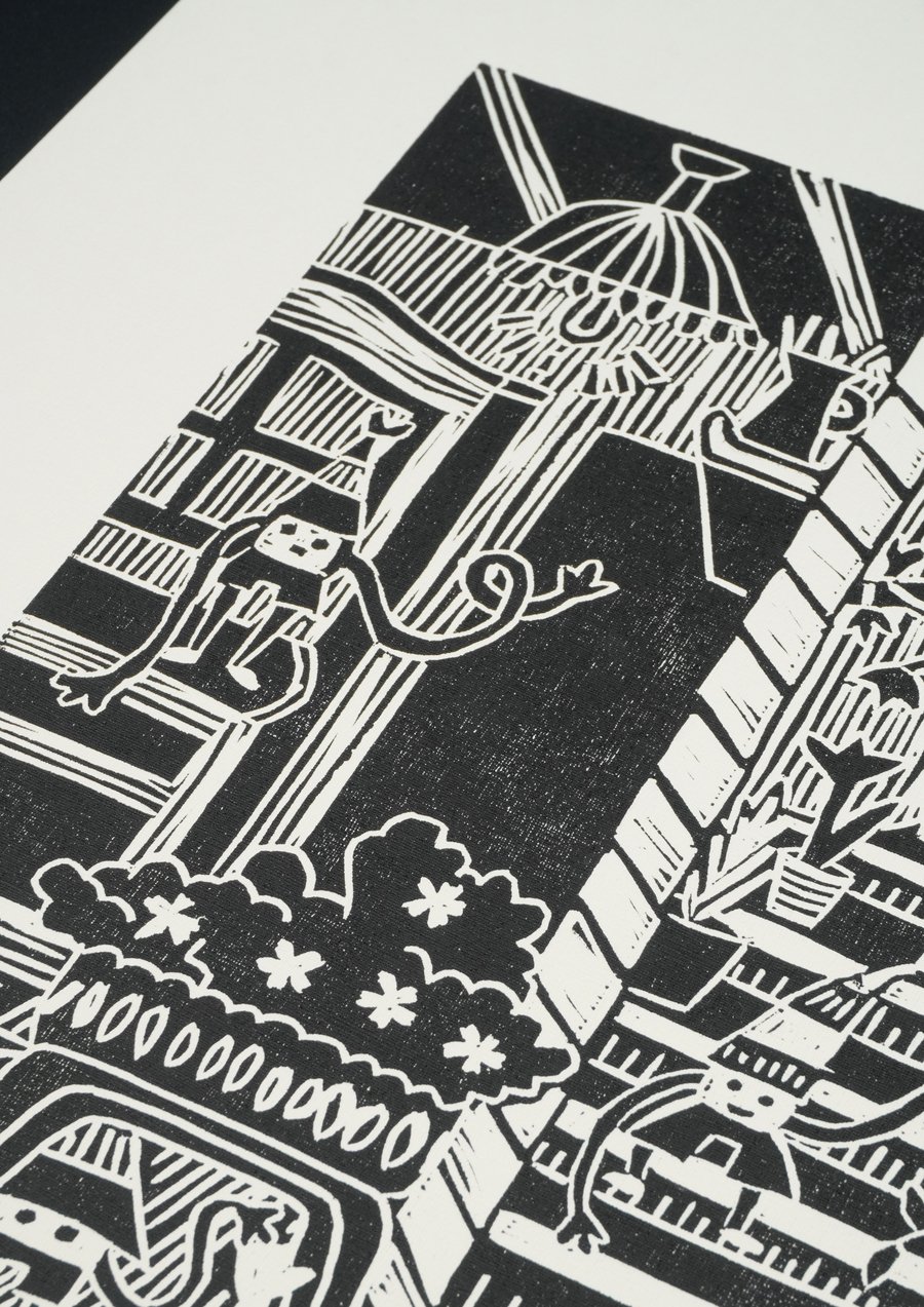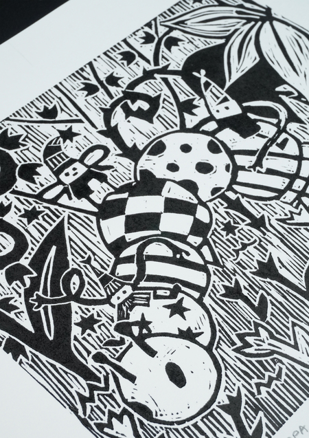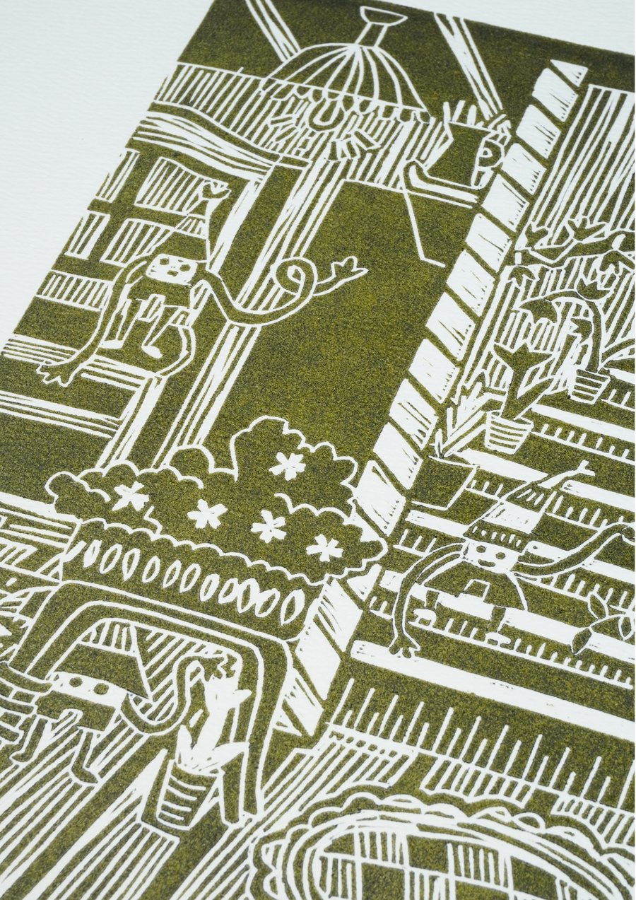 «Гномики в домике», 2025, линогравюра, размер: 29,7 см х 42 см