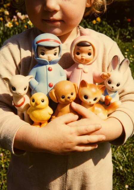 Финальной частью проекта стало создание семи фигурок: девочки, мальчика, козлёнка, зайца, собачки, котика и цыплёнка. Эти игрушки были выбраны не случайно — они наиболее близки к оригинальным фигуркам, сохраняя их пропорции и детали. Это позволило передать атмосферу тех времён и максимально точно воспроизвести те игрушки, которые стали частью детства. Воссоздавая их, я стремилась сохранить не только внешний вид, но и ту тёплую атмосферу, которая пронизывает каждую из этих фигурок, чтобы они продолжали дарить радость, как и прежде.