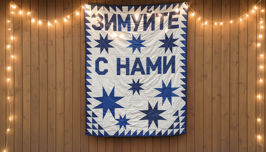 Промпт для одеяла: лоскутное одеяло с голубыми звездами и надписью белыми буквами «зимуйте с нами», висящее на фоне старой деревянной стены, подсвеченной гирляндами. при теплом освещении на ткани ложатся длинные тени