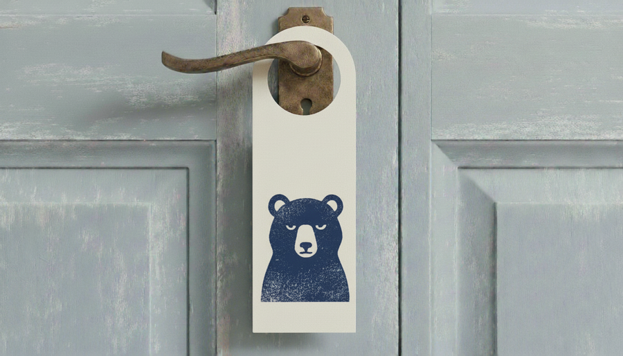 Промпт для дверного указателя: дверная вешалка с логотипом отеля с референса темно-синего цвета на белой бумаге, прикрепленная к винтажной дверной ручке на светло-серых деревянных входных дверях