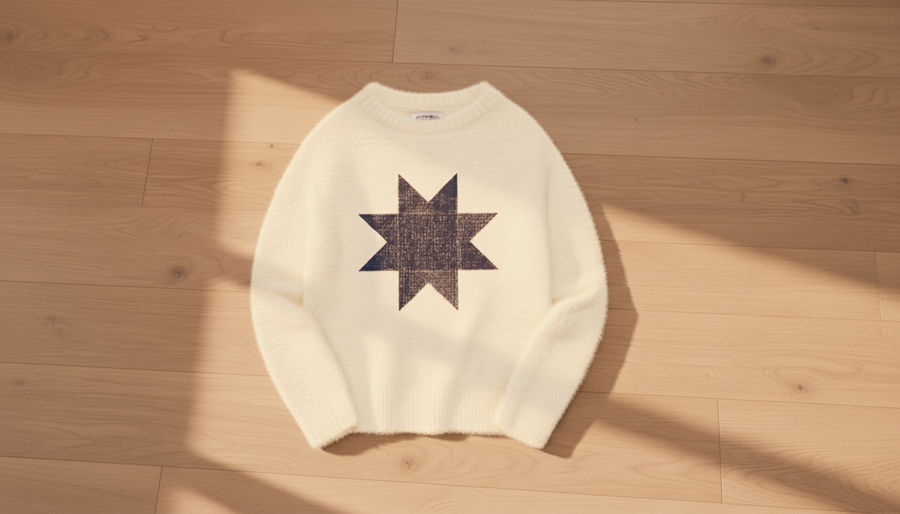 Промпт свитера: белый свитер с вышивкой в форме восьмиконечной звезды темно-синего цвета с референса, лежащий на полу из светлого дерева, освещенный естественным солнечным светом, подчеркивает его текстуру и детали