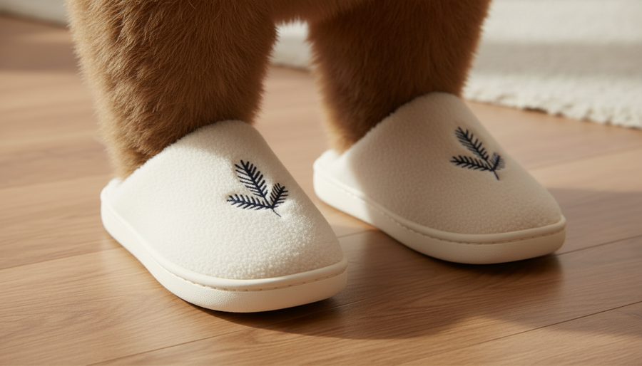 Промпт тапочек: тапочки с вышитыми еловыми ветками, на белой резиновой подошве, выполненные из пушистого материала, на лапке медведя, создающие теплую и уютную атмосферу, на фоне деревянного пола, снятые в высоком разрешении, с акцентом на детали обуви