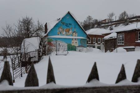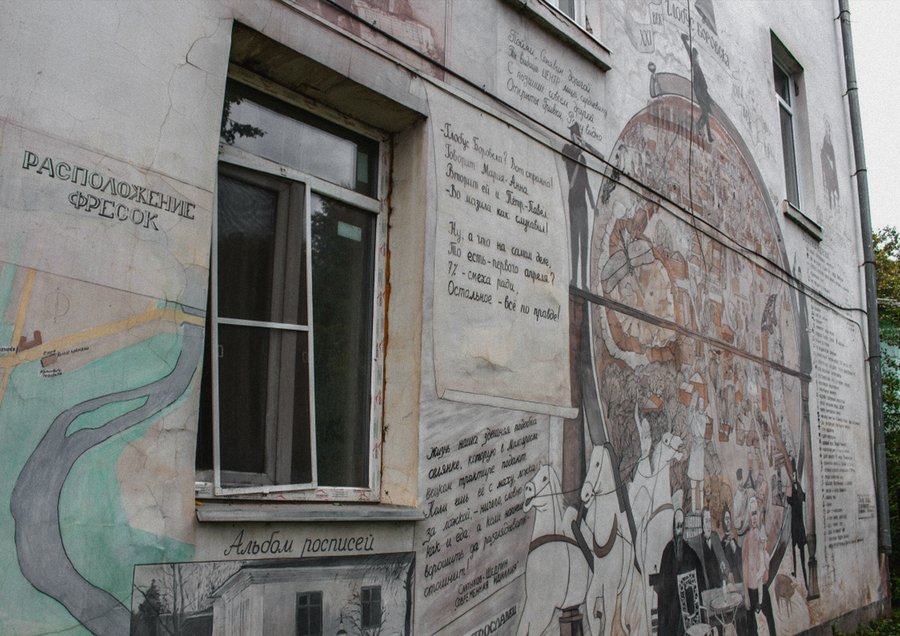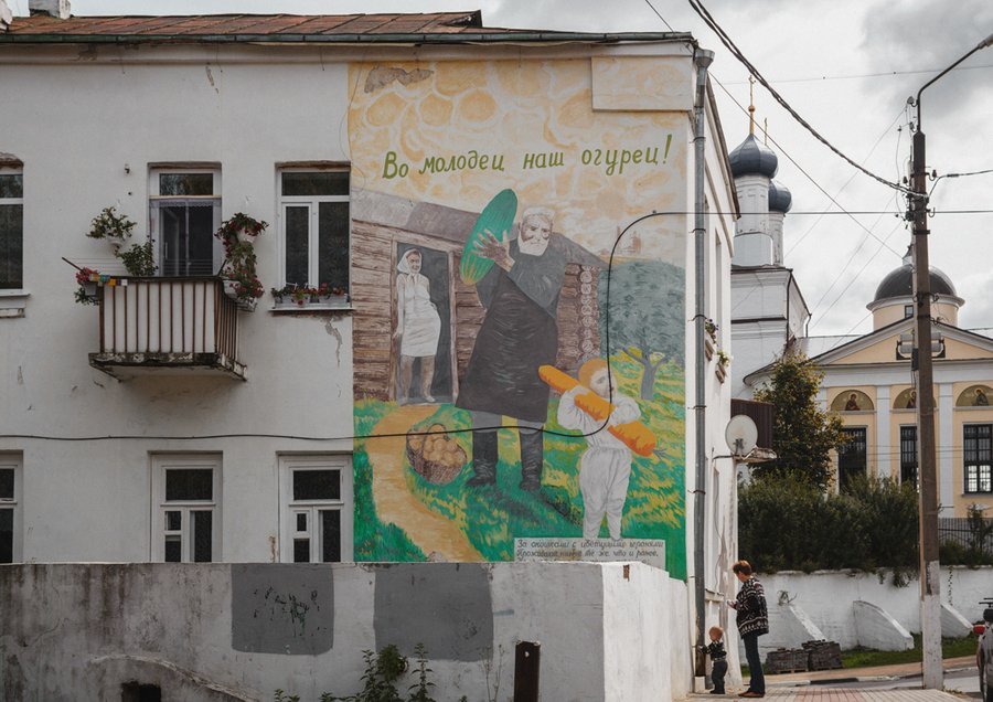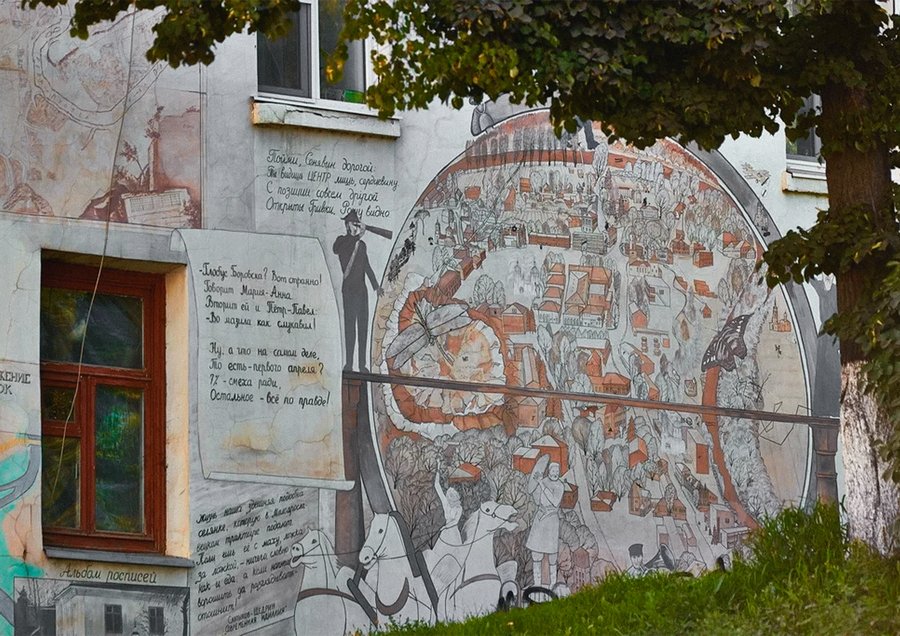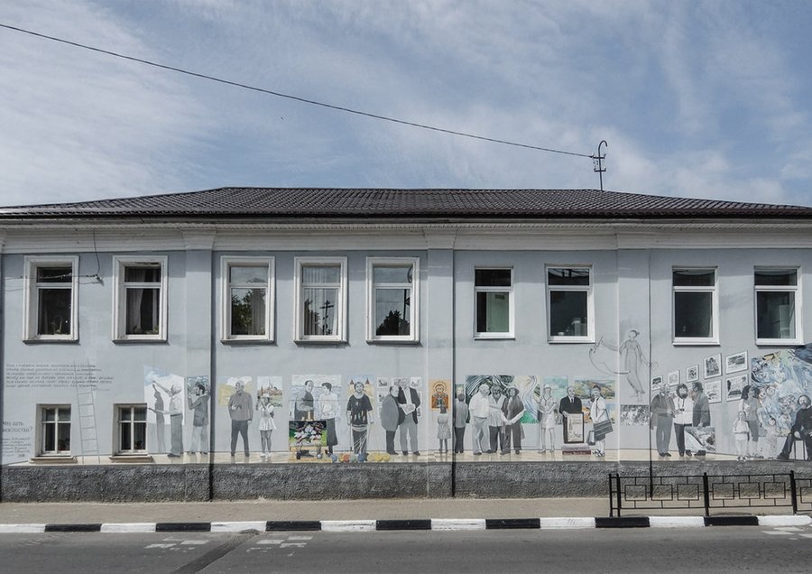 В последние десятилетия облик Боровска приобрел поистине уникальное измерение благодаря фрескам Владимира Овчинникова. Эти монументальные работы, выполненные художником-самоучкой на стенах домов, стали неотъемлемой частью визуальной идентичности города, превратив его в живую галерею под открытым небом. Работы Овчинникова не просто украшают фасады — они глубоко пропитаны историей, духом и культурой Боровска, создавая неповторимый диалог между прошлым и настоящим.