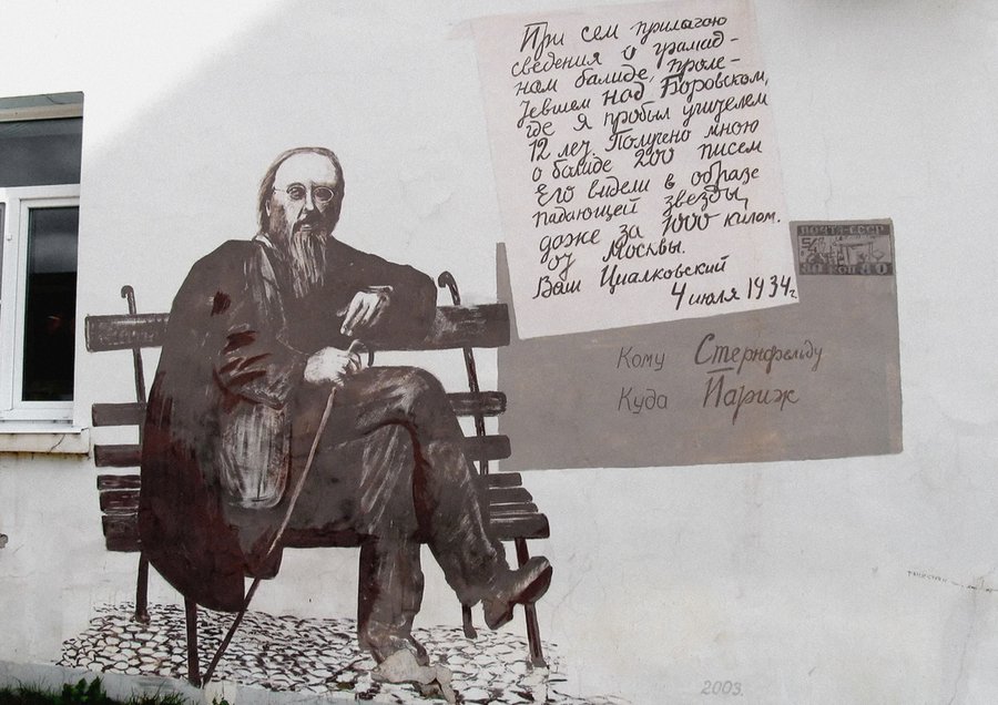 Фреска с изображением Константина Эдуардовича Циолковского находится на доме № 1 по улице Коммунистической. На фреске Циолковский устремляет взгляд к далёким мирам.