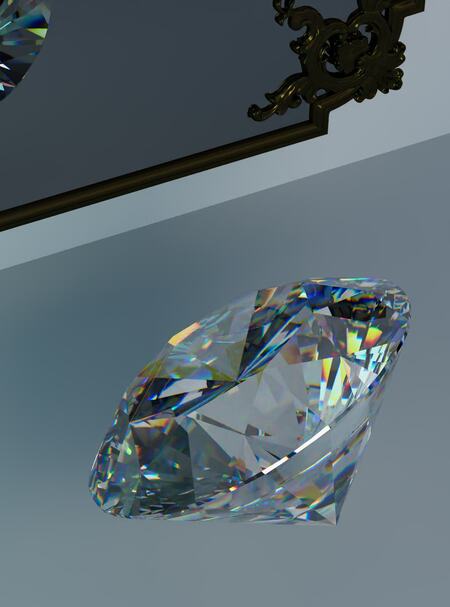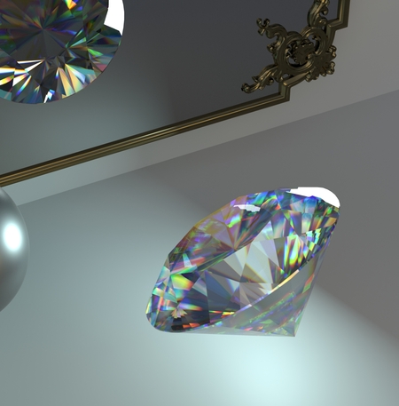 На кадрах выше продемонстрирована разница, появляющаяся при выключении дисперсии в настройках материала редшифта. На верхнем кадре дисперсия включена (значение 50), и это сразу видно по радужным артефактам: каустики на плоскости и в зеркале приобретают цветные края, внутри алмаза много мелких спектральных бликов, а общий свет от камня чуть «размазывается» по спектру. Энергия того же белого источника распределяется между разными длинами волн, поэтому пятна не чисто белые, а с характерными переливами.