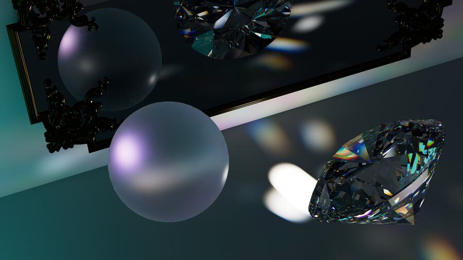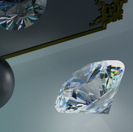 Тем не менее глубина преломлений остаётся низкой, поэтому дисперсия хоть и становится более яркой, но всё ещё не обладает сложной структурой. Радужные переливы выглядят контрастнее, однако не демонстрируют полного спектрального поведения. Алмаз начинает «светиться» убедительнее, но внутренняя геометрия всё ещё недостаточно прорабатывается из-за малой глубины refraction chain.