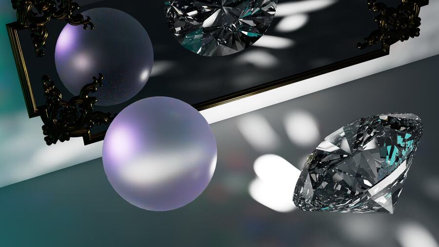 Второй тестовой сценой для сравнения рендер-движков выбран небольшой «натюрморт» с алмазом, зеркалом, металлической рамой и двумя матовыми сферами. В отличие от портрета, эта сцена специально построена так, чтобы максимально нагрузить движки на отражениях, преломлениях и каустиках. В ней одновременно присутствуют: сложный прозрачный объект с дисперсией (алмаз), крупная зеркальная поверхность (зеркало), металл с мелкими деталями (рама) и матовая сфера, на которой хорошо читаются мягкие тени и рассеянный свет. Такой набор позволяет оценить, как каждый рендер считает дисперсию, яркость и форму каустик, качество отражений и непрямого освещения, а также уровень шума при небольшом количестве сэмплов.