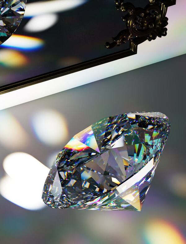 Добавление высокого Refraction Limit даёт движку возможность многократно преломлять лучи внутри алмаза, моделируя реальную сложность прохождения света через огранку. Именно на этом шаге начинает проявляться физически корректная дисперсия: лучи многократно переотражаются и перераспределяются между гранями, формируя яркие, чистые спектральные переливы и детализированную каустику.
