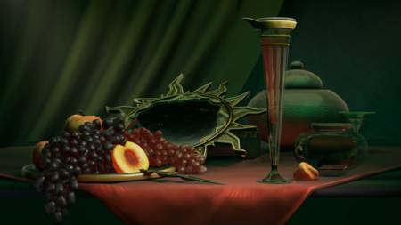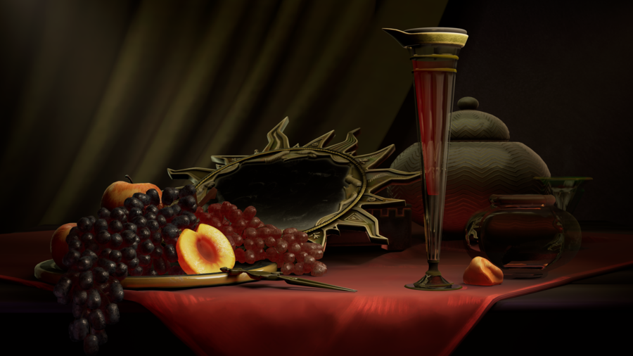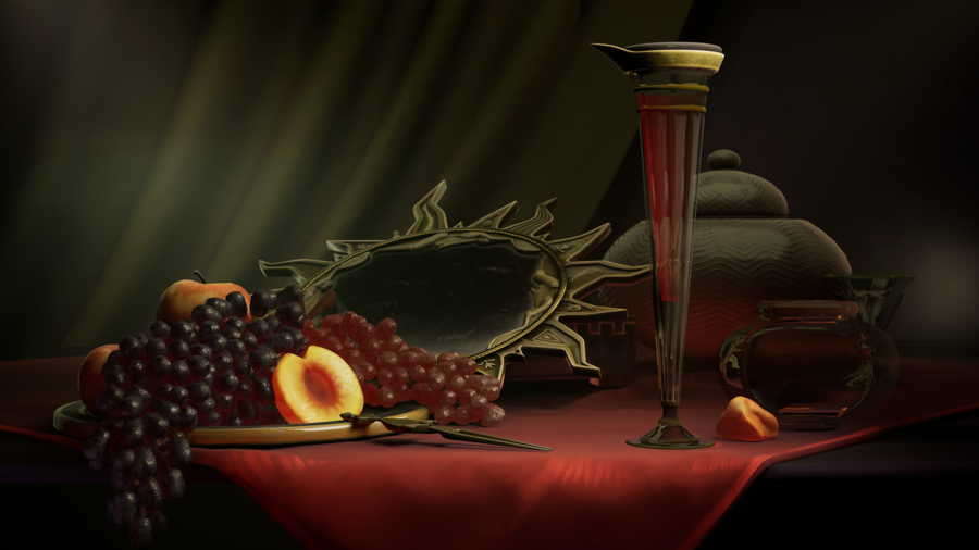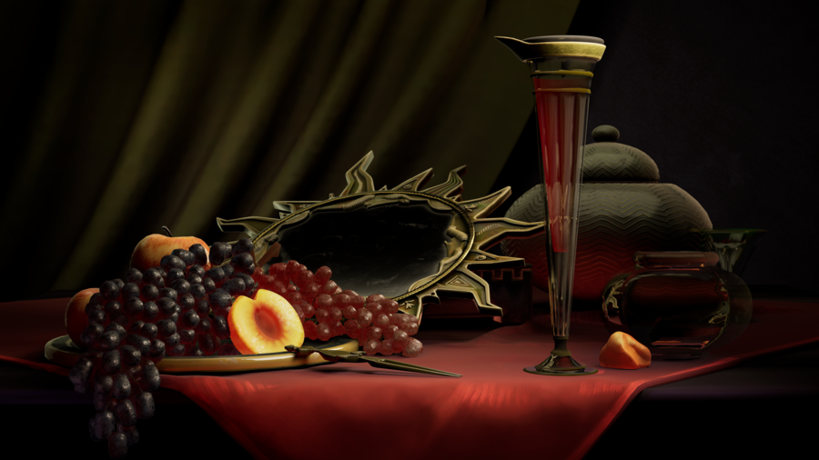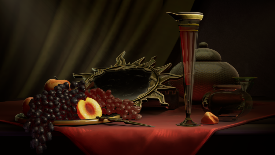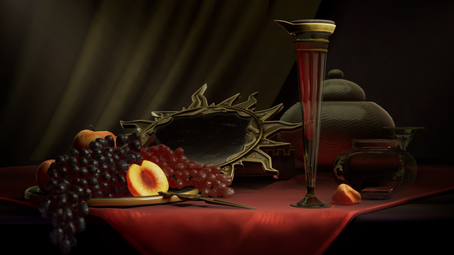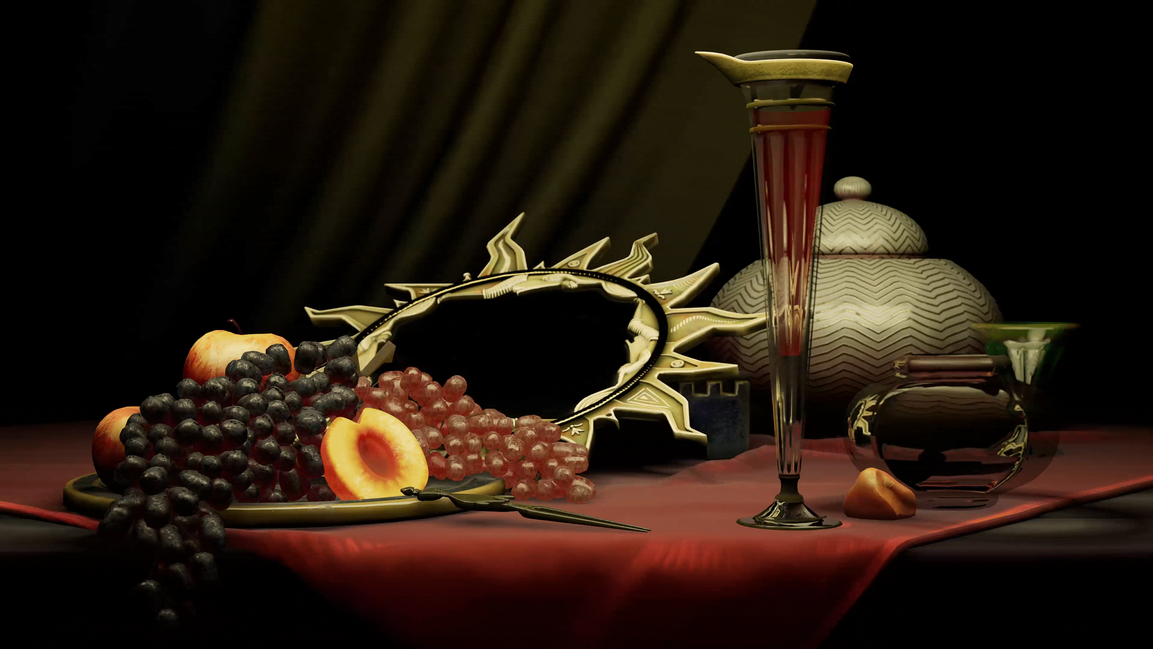 Для проведения эксперимента была создана демонстрационная сцена, структура которой оптимальна для сравнительного анализа различных методов рендеринга, поскольку включает объекты с блестящими материалами, подповерхностным рассеиванием (SSS) и прозрачностью.