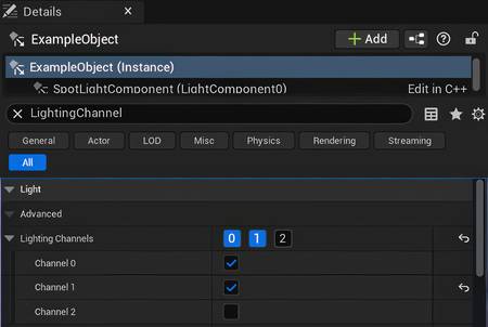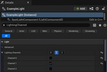 Данный параметр находится в настройках Details как для объектов, так и для источников освещения в сцене. По умолчанию все объекты и источники освещения используют только канал 0. При переключении источника света на канал 1, он будет влиять исключительно на объекты, у которых также активирован канал 1. Однако это не обязательно ограничивает влияние других источников на данный объект, поскольку каналы можно комбинировать: объект может воспринимать свет от источников как с каналом 0, так и с каналом 1.