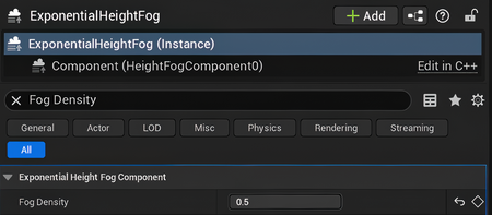 Первый представляющий наибольший интерес компонент — Height Fog. Height Fog обладает множеством настроек, применимых для создания эффекта тумана, что особенно заметно в открытых масштабных локациях, но ключевой интерес для исследования представляет возможность Height Fog создавать волюметрическое освещение2.
