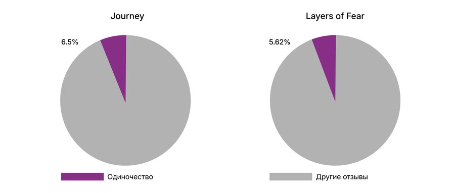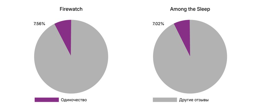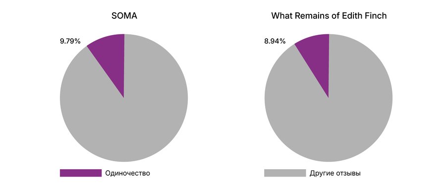 Во всех исследуемых играх присутствует значимый процент отзывов, связанных с одиночеством. Для некоторых — особенно Never Alone, SOMA и Edith Finch — тема одиночества особенно выраженна.
