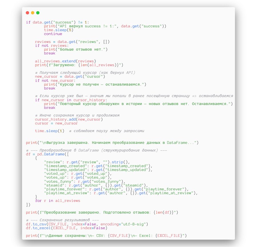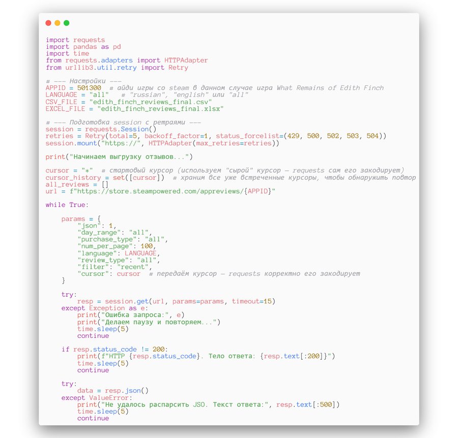 Для своего исследования я выбрала игры, опираясь на отзывы игроков из самого популярного маркетплейса видеоигр — Steam. Используя открытый источник датасетов kaggle, язык программирования Python и SteamAPI я выгрузила с маркетплейса текстовые отзывы по играм, которые пользователи в сети считают наиболее атмосферными и которым присуще ощущение одиночества.