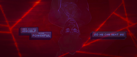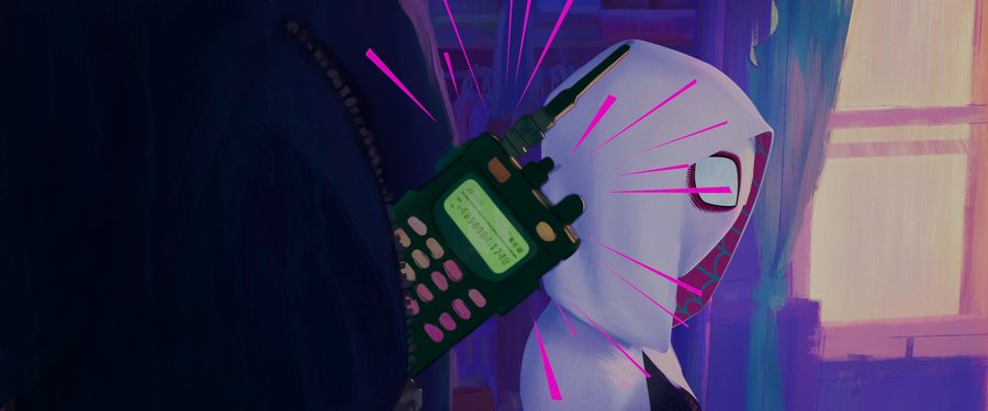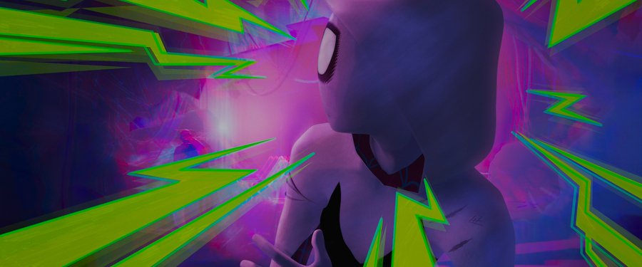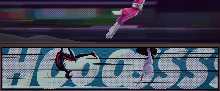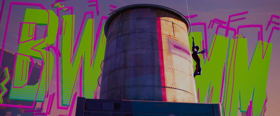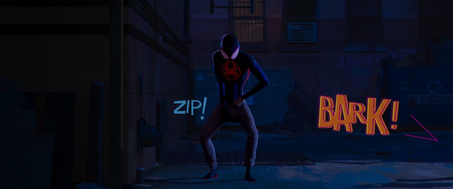 Ещё одним уникальным стилем комикса является разделение кадра на статические «панели», как в комиксе. Действие замирает, а потом взрывается, перескакивая с одной части экрана на другую. Мы видим мысленные пузыри, звукоподражательные надписи «POW!» или «BOOM!», которые не просто сопровождают действие, а являются его частью (Удар по лицу сопровождается вспышкой слова «БАЦ!», которое отбрасывает тень, а паутина выстреливает с знакомым «ТУУУ!»).