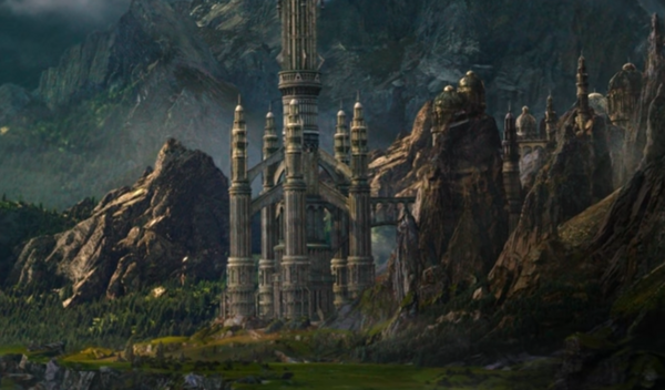 Замок Медива-хранителя представляется в фильме высокой башней, окружённой другими башнями, к которым ведут сквозные переходы, напоминающие контрфорсы. К башням поменьше ведёт аркада, архитектурно напоминающая акведук. Здание похоже на готический храм, но как и собор в Штормграде имеет нюансы в логике своего устройства и имеет исторический прототип из эпохи барокко.