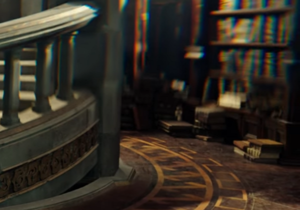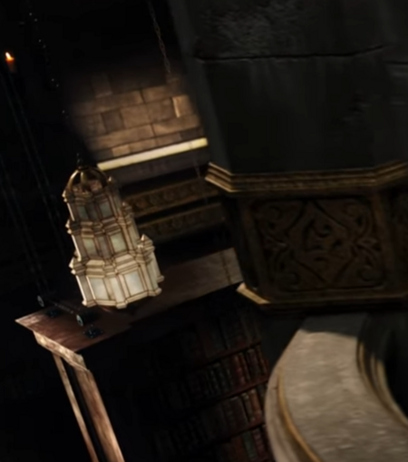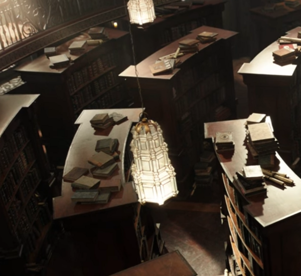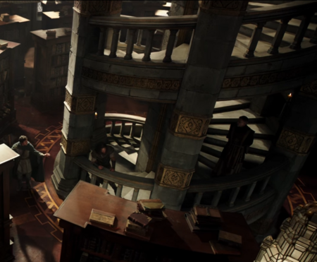 По периметру центральной башни проходит библиотека с продуманным узорным паркетом, напоминающим шестерёнку, образ который можно также встретить на полу в Святилище Хранителя выше. Примечательно и оформление оконных проёмов библиотеки: на ней мы видим сложную орнаментику готического образца, со вписанным символом всевидящего ока, который является сквозным символом, прослеживающимся в Покоях Медива.