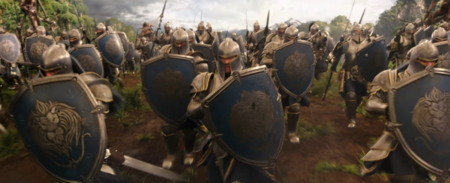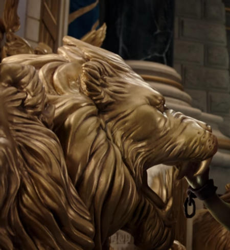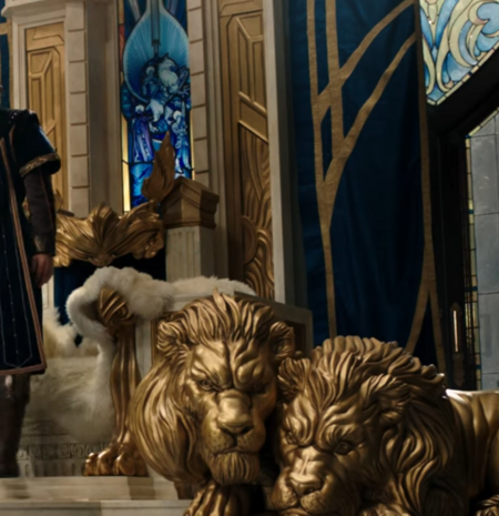 Мотив льва — ключевой для создания образа короля, он символизирует королевское начало. В историческом контексте в средневековом искусстве и бестиариях лев считался царём зверей, а в христианской традиции он также мог символизировать Христа, что добавляет образу сакральную значимость. Многочисленность львов в зале могла быть отсылкой к идее о том, что настоящая сила правителя в поддержке его подданных и союзников. В данном контексте событий это могло поддерживать идею короля Ллейна Ринна о необходимости объединения всех сил альянса перед врагом. Тронное место выполнено совершенно уникально и аккумулирует в себе разные исторические образцы. Главный из них — мотив каменного трона царя Соломона со львиными масками, описанного в Ветхом завете. В средневековом и ренессансном искусстве этот трон был символом мудрости и богоугодной власти. Сразу бросается в глаза, что сами скульптуры львов в тронном зале расположены крайне нетипично. Это не классическая пара львов, поддерживающих трон или монумент, а практически целый прайд, который к тому же не полностью является опорой трона, а возлежит вокруг него. Львы изображены в разных позах и являются натуроподобными, но при этом они стилизованы подобно тем же львиным маскам эпохи классицизма.