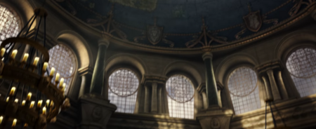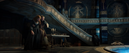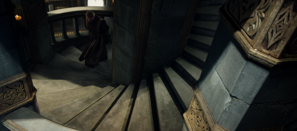 При визуализации сложной центральной лестницы, винтом поднимающейся наверх, в Покои Медива, применена строительная техника античного происхождения, когда ступени вбиваются в стену и образовывается подвесная винтовая конструкция. Лестница выглядит полупрозрачной и ажурной, несмотря на мощную рустовку. Она ведёт вверх в Святилище Хранителя, откуда разливается голубой благодатный свет.