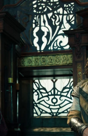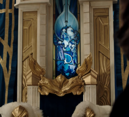 За самим троном мы видим орнамент, напоминающий эстетику ар-деко и витраж, готический по своему происхождению. Отдельное внимание необходимо обратить на его рисунок. Он поделён на три регистра: самый верхний — это король на грифоне, показанный в лучезарном сиянии как покровитель города, посередине — Медив с жезлом и рыцарь с мечом, охраняющие государство от врагов, и в нижнем регистре (который традиционно отводится под силы зла) — силуэтные образы, похожие на орков. Трон находится на значительно расстоянии от стены и верхняя часть голубого витража, находящегося позади него в стене, символично напоминает гриву льва.