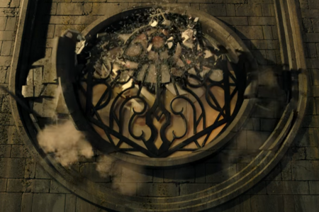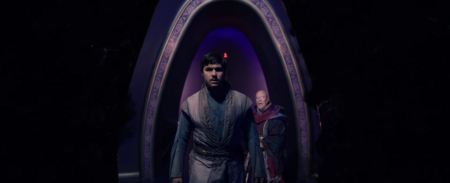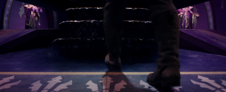 В сцене с порталом к высшему существу также присутствует центрическое сооружение, но уже не с круглым, а многогранным. В центре композиции находится чёрный магический куб, покрытый магическими символами. Гамма в зале сменяется на сложную и насыщенную лиловую, которая ассоциируется с грозой, закатом — метафорой конца или обновления жизни человека.