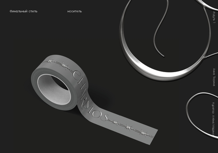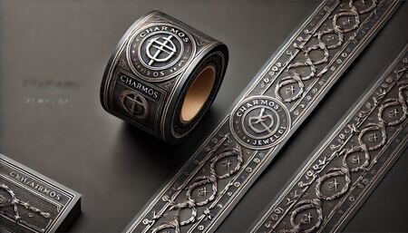 «Elegant roll of luxury branding tape for 'Charmos, ' featuring embossed barbed wire motifs and the 'Charmos' logo in a refined neo-tribal style. Matte and metallic textures combine to create a high-quality, sophisticated packaging element. Perfect for branding premium jewelry items, isolated on a dark background for a striking, upscale effect.»
