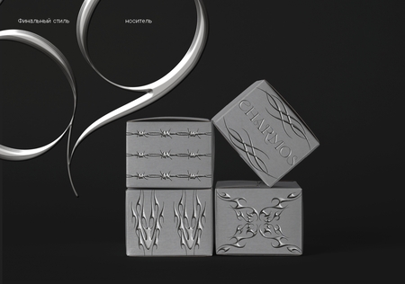 «Exquisite paper wrap packaging for the luxury 'Charmos' jewelry brand, adorned with minimalist barbed wire patterns and subtle neo-tribal accents. Sleek, elegant branding with a premium black and white color scheme, high-quality textured finish, conveying sophistication and exclusivity. Perfect for high-end jewelry presentation, isolated on a dark background.»