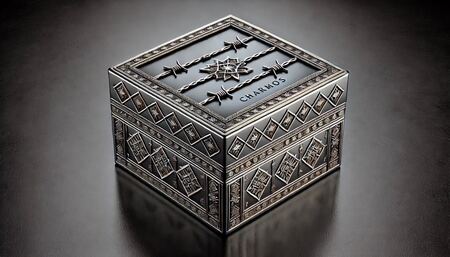 «Ultra-luxury jewelry box for 'Charmos, ' featuring a metallic silver finish with embossed barbed wire and refined tribal patterns. Elegant, minimalist design with precise craftsmanship, monochrome black and silver color scheme, tailored for premium jewelry presentation. Sophisticated detailing that speaks to exclusivity and high-end brand identity, isolated on a dark, luxurious background.»