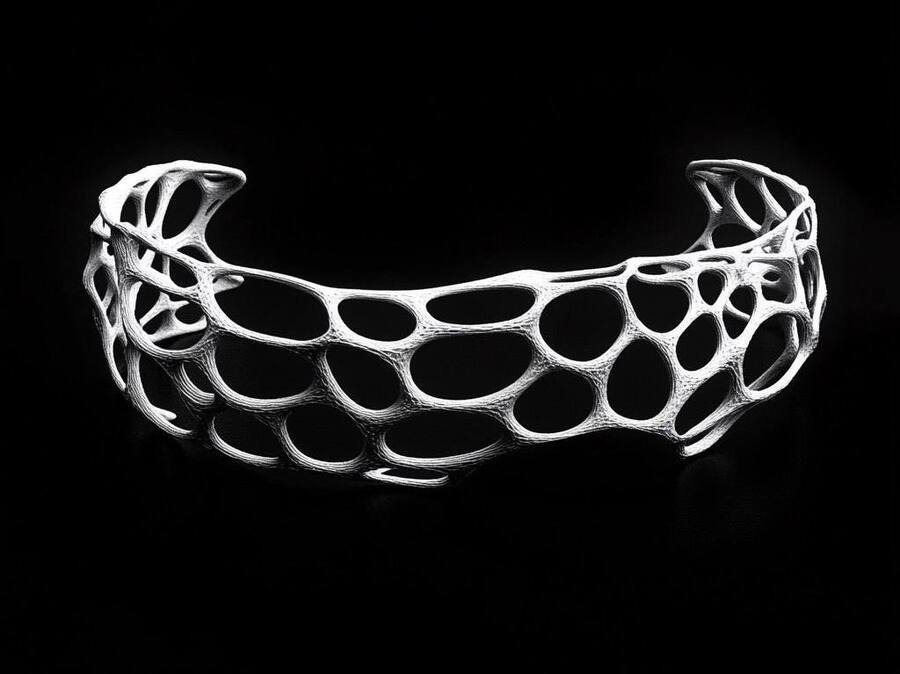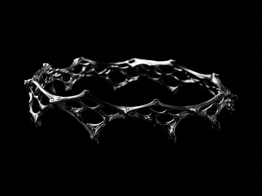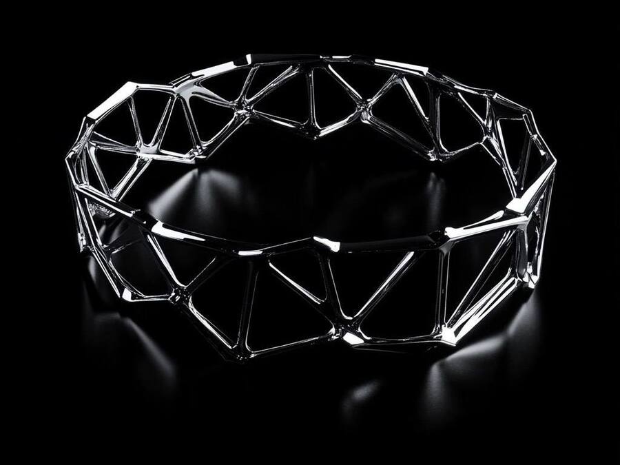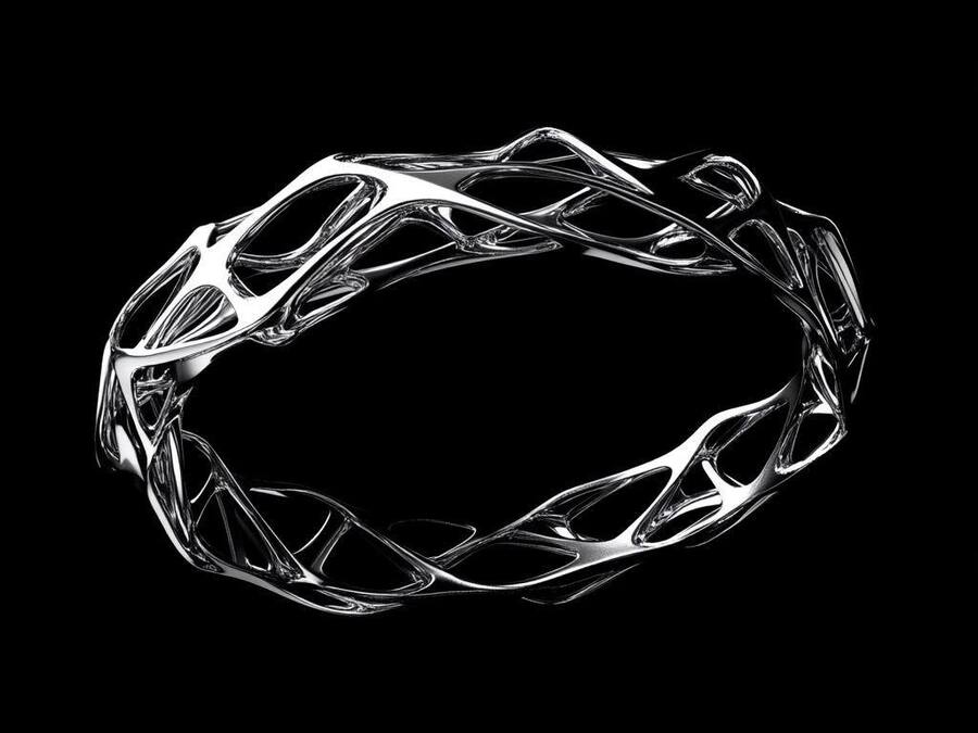 /imagine prompt: Generate open-structured bracelet with an intricate geometric, lattice-like design, inspired by generative art. The bracelet should have a smooth, metallic finish and appear light and airy with a complex, webbed structure. Place the bracelet on a solid black background to highlight its details, shadows, and reflections, emphasizing a modern, sculptural aesthetic