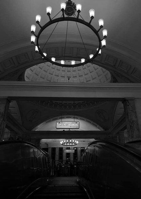 Эскалатор работает как акустическое время метро: его звук не изменяется и задаёт темп движения массы людей. Это — механическая постоянность, которая удерживает ритм подземной повседневности.