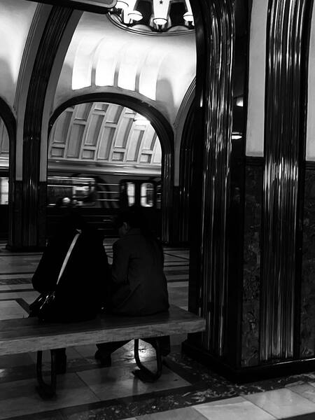Автоматизированный голос диктора — чистый, слегка отстранённый — звучит как интонационный маркер маршрута. Он структурирует подземное время, превращая движение в последовательность звуковых глав: «Следующая станция…», «Осторожно, двери закрываются».